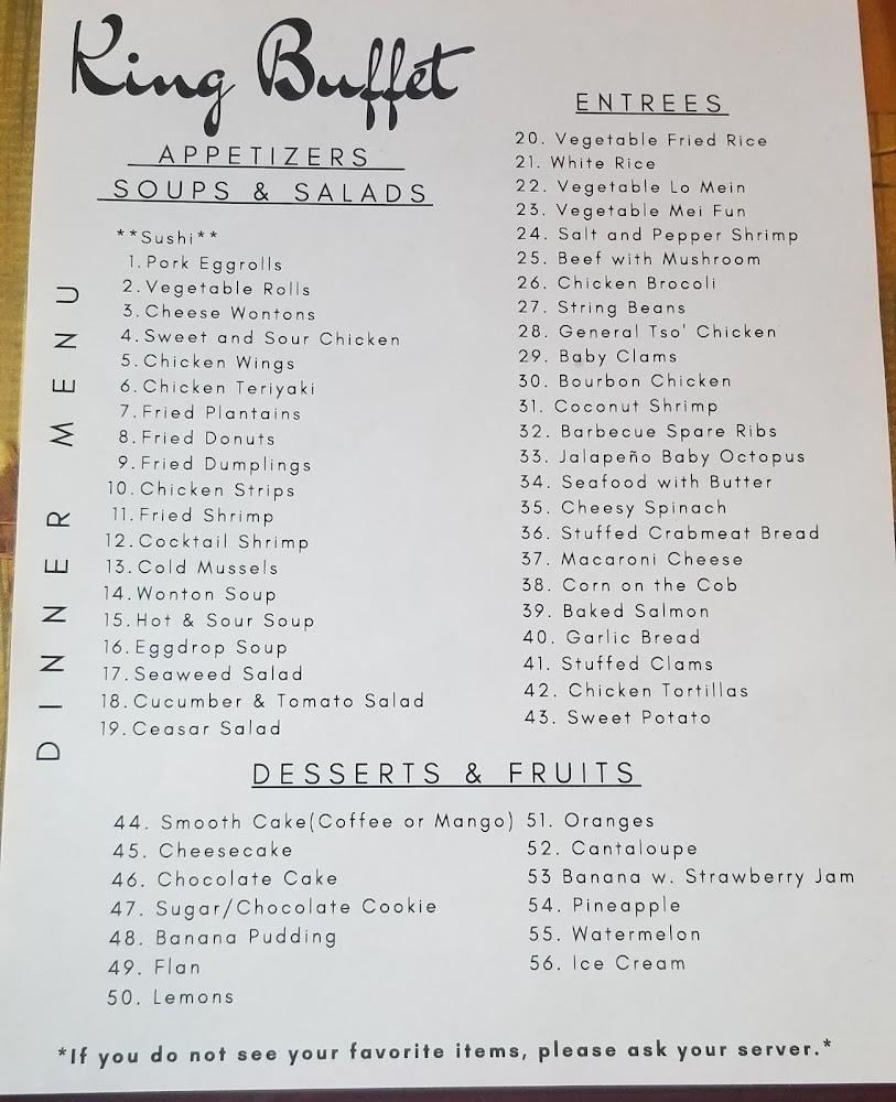 King Buffet presents an extensive all-you-can-eat menu. Choices include classic Chinese meals like lo mein, dumplings, and a variety of meat dishes. Vegetarians find plenty of options, keeping meals inclusive for all tastes.